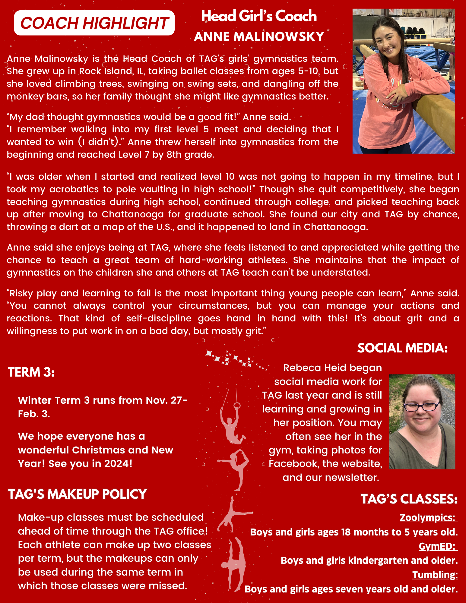 Anne Malinowsky, Head Coach of TAG’s girls’ gymnastics team, brings enthusiasm and dedication to her role. Growing up in Rock Island, IL, she transitioned from ballet to gymnastics and quickly excelled, reaching Level 7 by 8th grade. Now in Chattanooga, she emphasizes grit and self-discipline, guiding young athletes with passion and care.