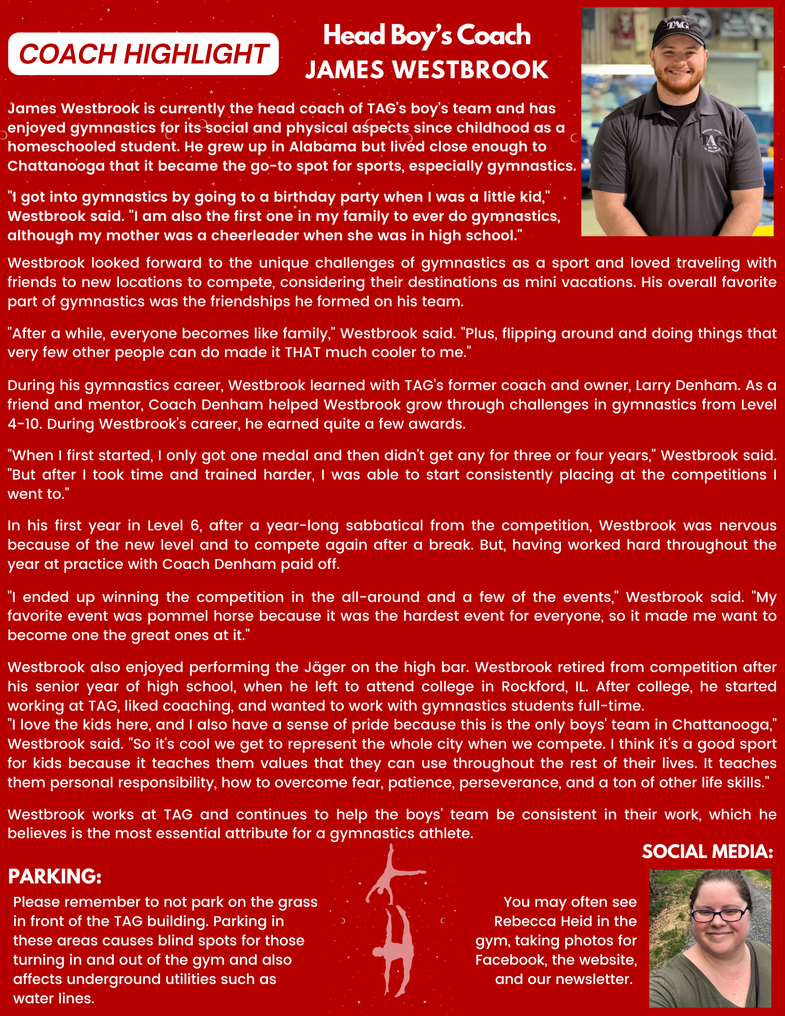 James Westbrook, head coach of TAG's boys' team, has loved gymnastics for its social and physical aspects since childhood. Growing up in Alabama, he started gymnastics after a birthday party and quickly embraced its challenges and camaraderie. Now, he passionately coaches in Chattanooga, emphasizing personal responsibility, perseverance, and grit to his athletes.