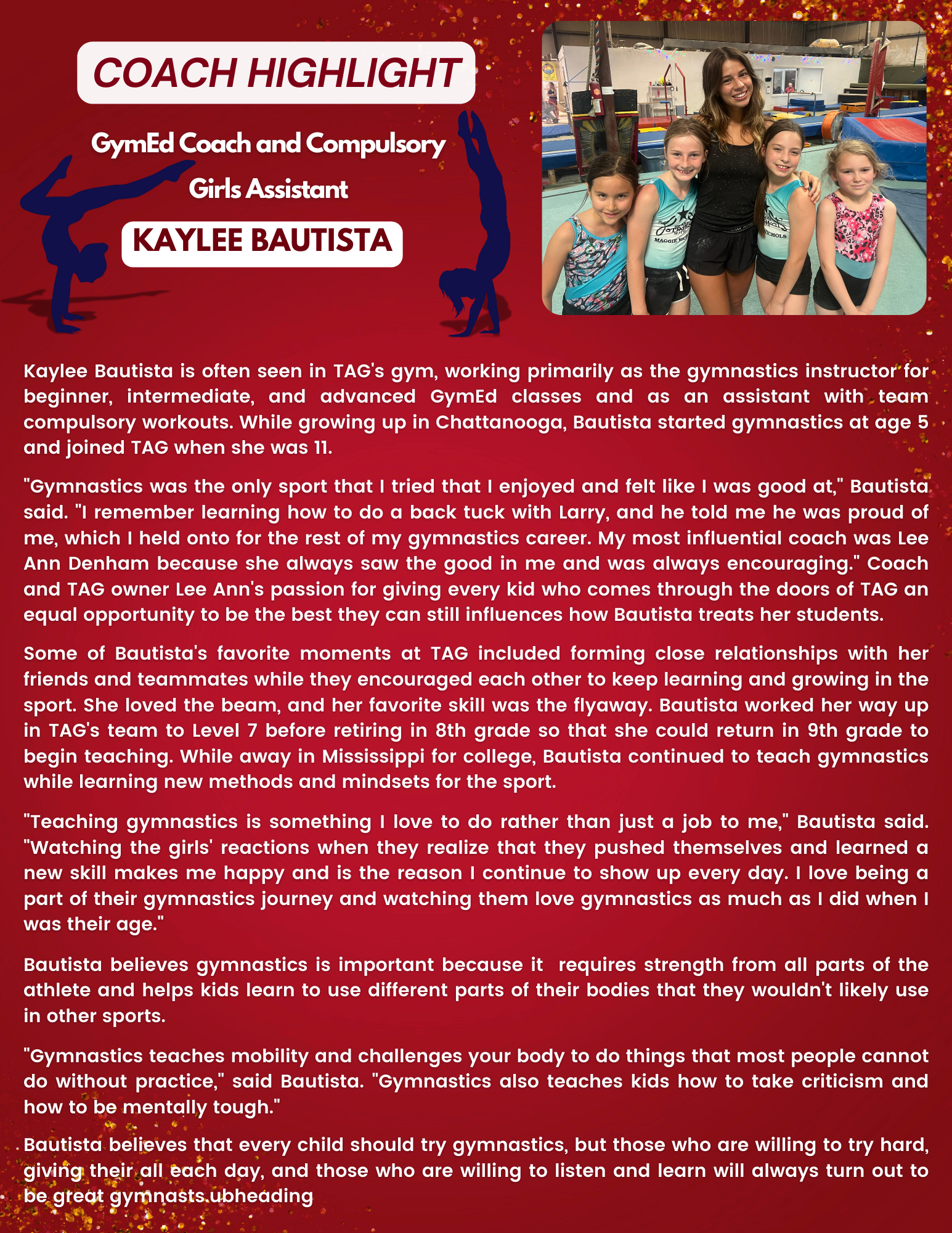 Kaylee Bautista, a dedicated gymnastics instructor at TAG, coaches beginner to advanced GymEd classes and assists with team compulsory workouts. Starting gymnastics at age five and joining TAG at 11, she was inspired by coaches Larry and Lee Ann Denham. Reaching Level 7 before retiring in 8th grade, Kaylee now loves teaching, fostering young athletes' growth and love for gymnastics.