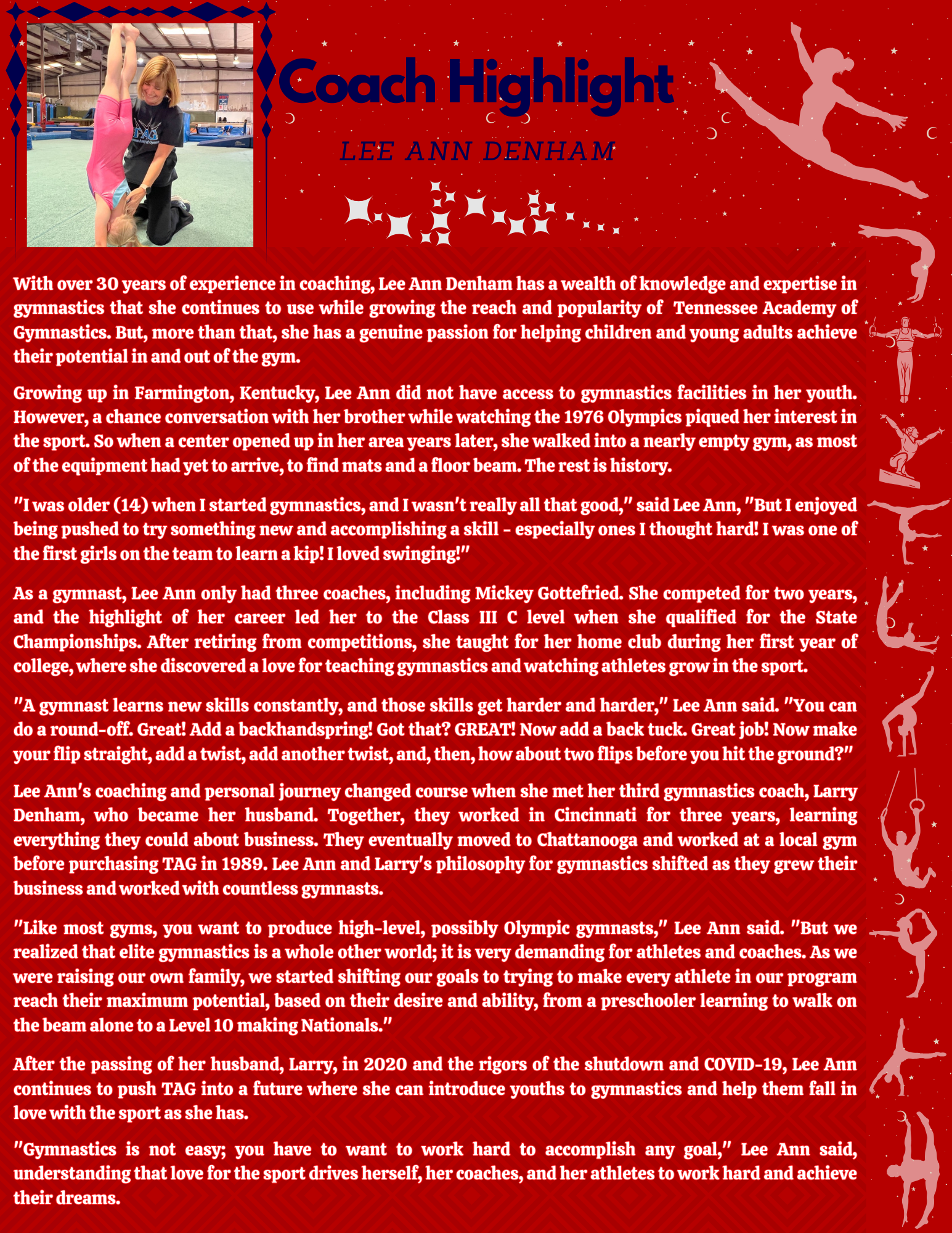 With over 30 years of experience, Lee Ann Denham brings a wealth of knowledge and passion to gymnastics coaching. Growing up in Farmington, Kentucky, she discovered gymnastics at 14 and never looked back. Today, she continues to inspire and guide young athletes at the Tennessee Academy of Gymnastics, emphasizing personal growth and perseverance.