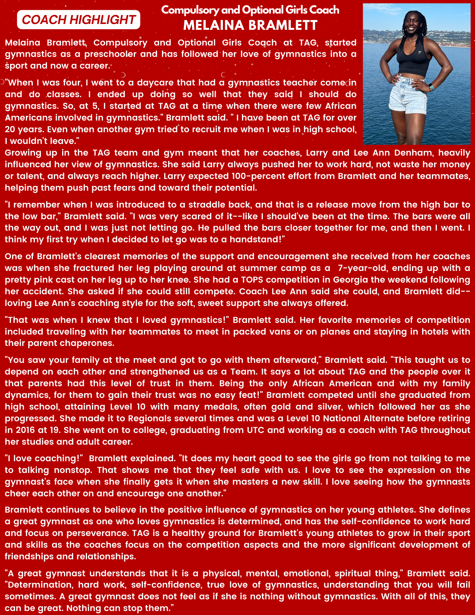 Melaina Bramlett, Compulsory and Optional Girls Coach at TAG, began gymnastics at age five and has been with TAG for over 20 years. Her coaches, Larry and Lee Ann Denham, deeply influenced her, instilling hard work and determination. She reached Level 10 and now loves coaching, fostering young athletes' growth, confidence, and love for gymnastics.